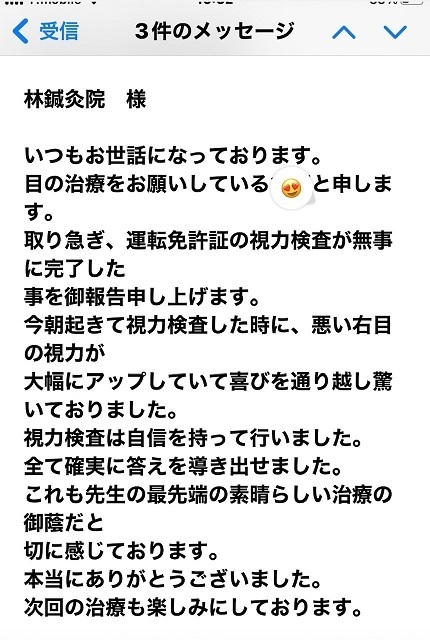 原因不明の眼ケイ下垂だと鍼灸治療を始まった。1回でかなり良くなり、2回をしたら完治しました。本人は信じられないと、とても喜んでくれました。